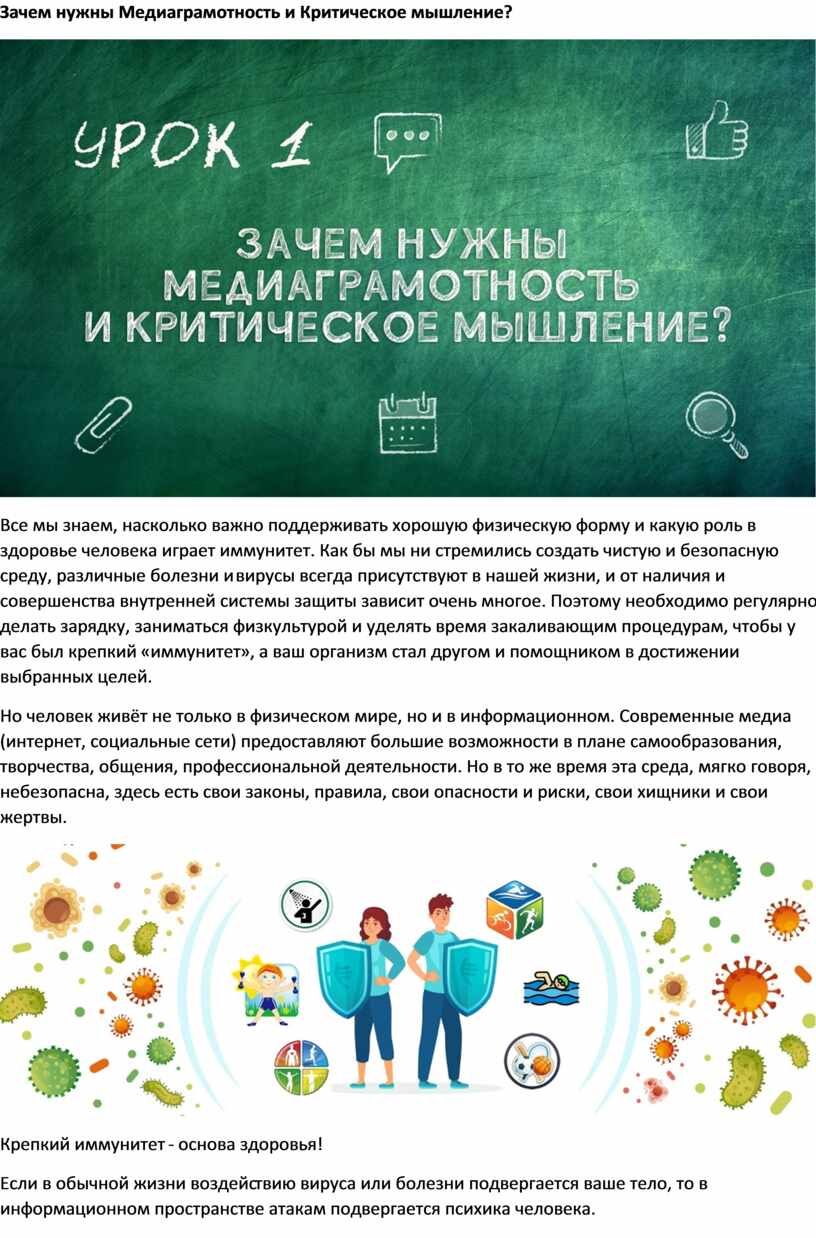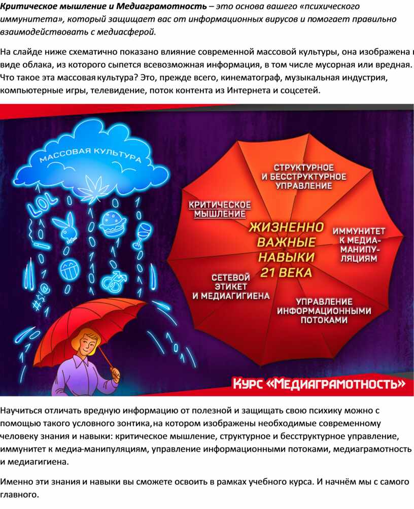 Критическое мышление и Медиаграмотность – это основа вашего «психического иммунитета», который защищает вас от информационных вирусов и помогает правильно взаимодействовать с медиасферой.