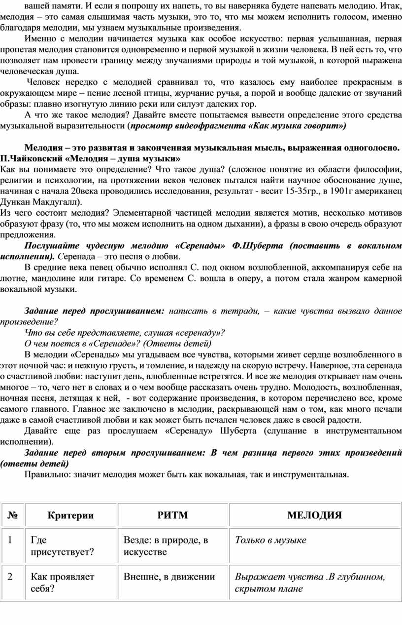 Задачи: 1. Привести учащихся к новым понятиям (мелодия, серенада). Познакомить