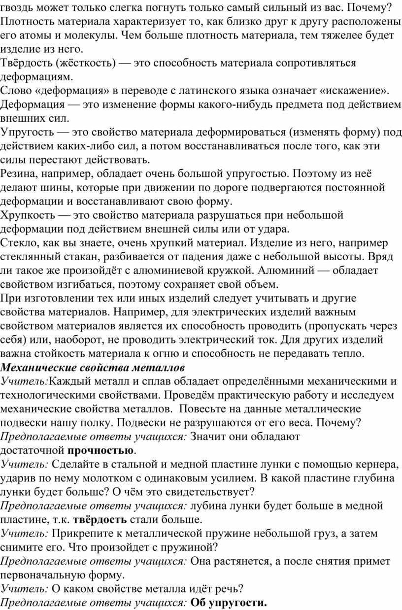 Учитель: Возьмите металлическую проволоку и согните её. О каком свойстве идет речь? Предполагаемые ответы учащихся: О пластичности.