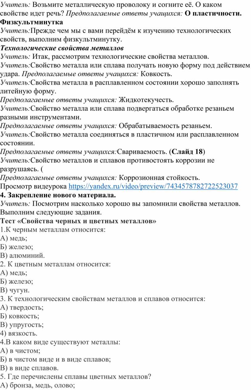 Предполагаемые ответы учащихся: Обрабатываемость резаньем. Учитель:Свойство металла соединяться в пластичном или расплавленном состоянии.
