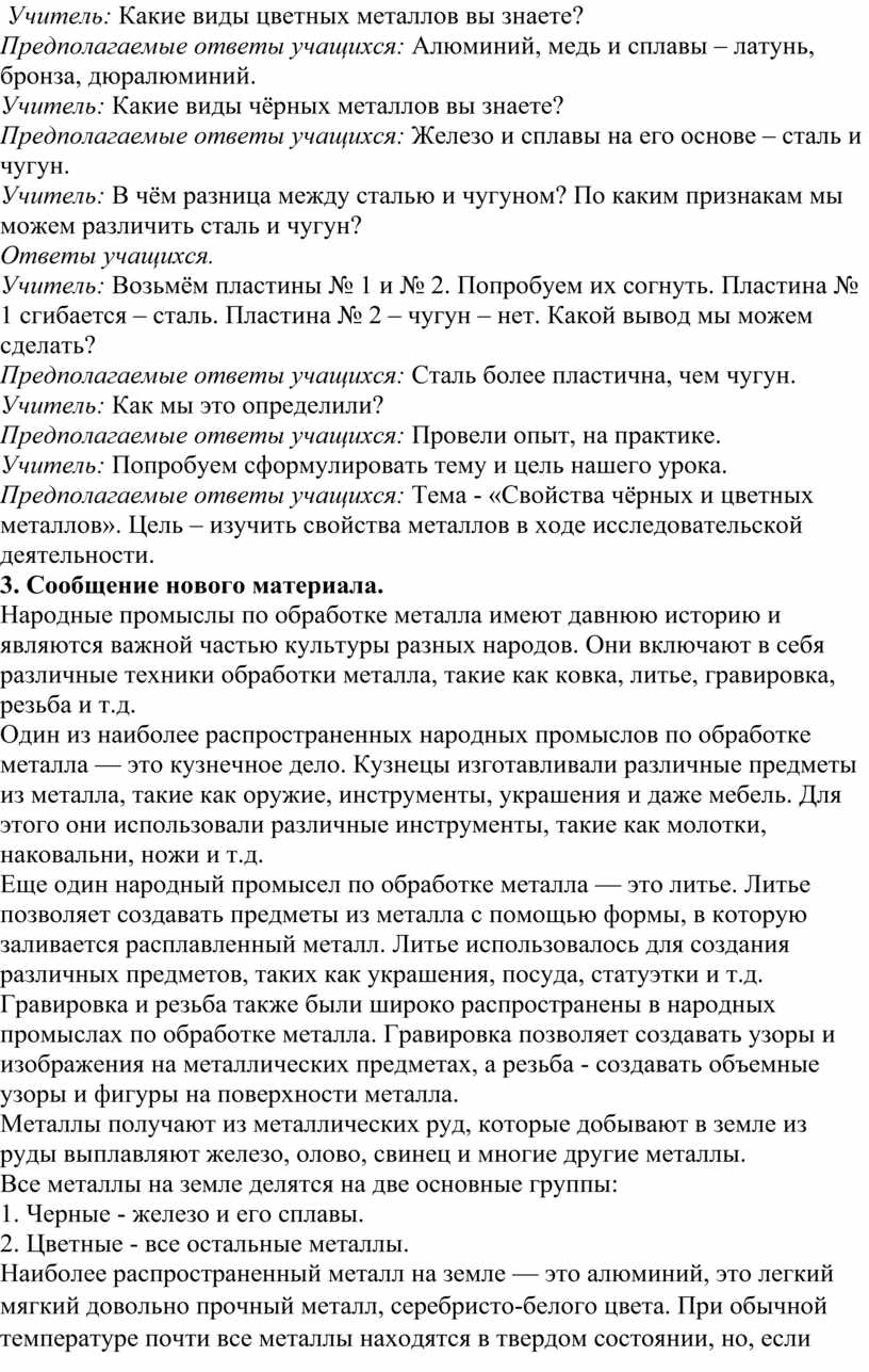 Предполагаемые ответы учащихся: Тема - «Свойства чёрных и цветных металлов». Цель – изучить свойства металлов в ходе исследовательской деятельности.