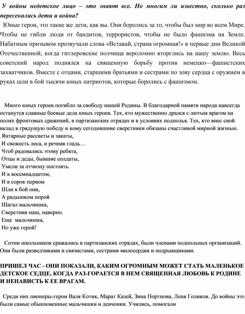 Юные герои, это такие же дети, как вы. Они боролись за то, чтобы был мир во всем Мире. Чтобы не гибли люди от бандитов, террористов, чтобы не было фашизма на Земле. Набатным призывом прозвучали слова «Вставай, страна огромная!» в первые дни Великой Отечественной, когда гитлеровские полчища вероломно вторглись на нашу землю. Весь советский народ поднялся на священную борьбу против немецко—фашистских захватчиков. Вместе с отцами, старшими братьями и сестрами по зову сердца с оружием в руках шли в бой тысячи юных патриотов, которые боролись с фашизмом.