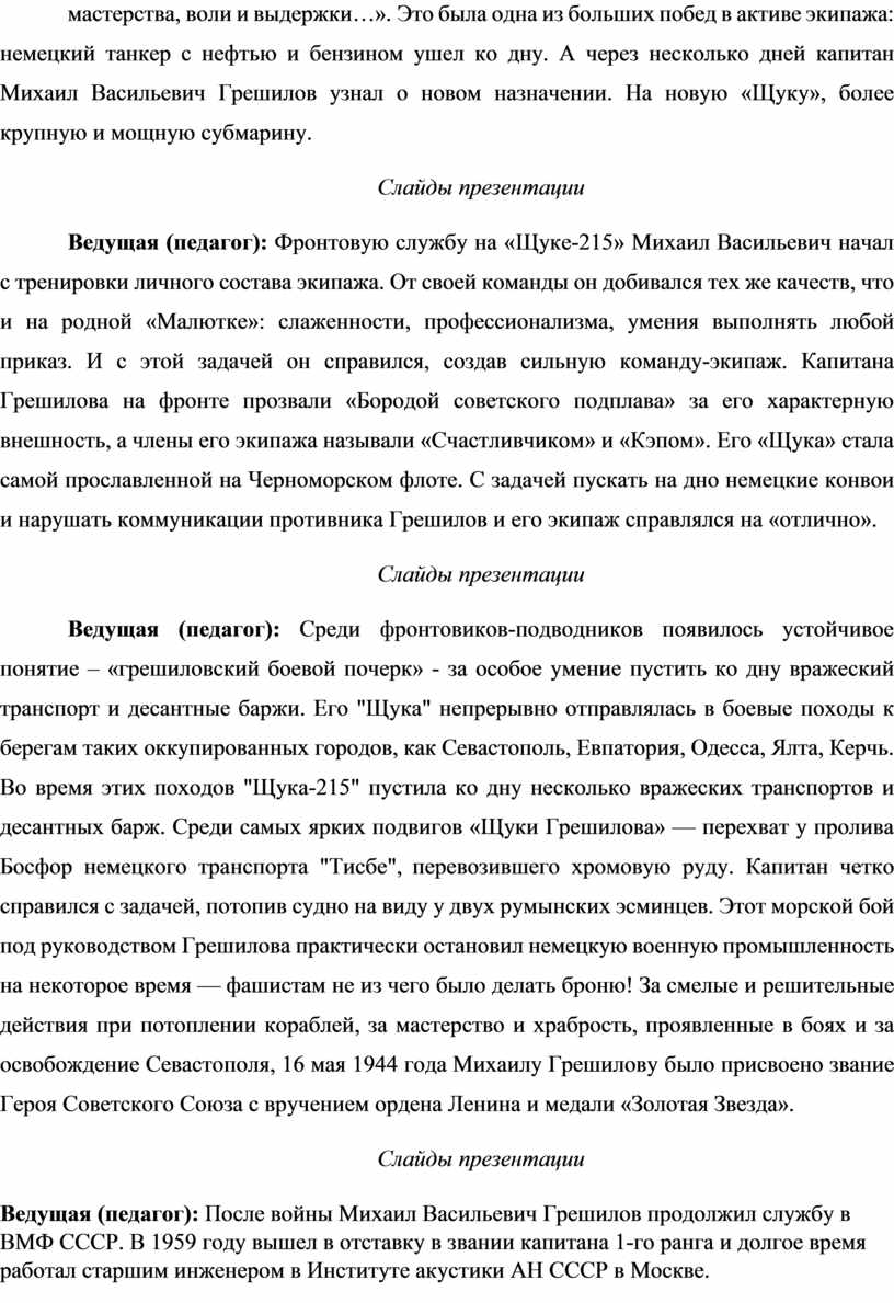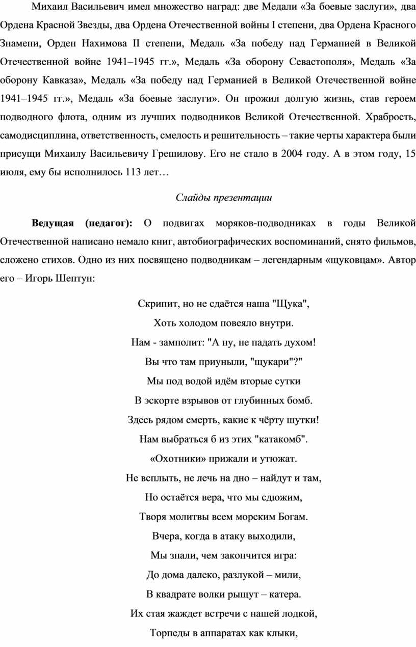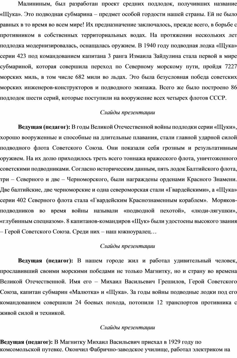 Ведущая (педагог): В нашем городе жил и работал удивительный человек, прославивший своими морскими победами не только Магнитку, но и страну во времена Великой Отечественной. Имя его – Михаил Васильевич Грешилов, Герой Советского Союза, капитан субмарин «Малютка» и «Щука». За годы войны подводные лодки под его командованием совершили 24 боевых похода, потопили 12 транспортов противника с живой силой и техникой.