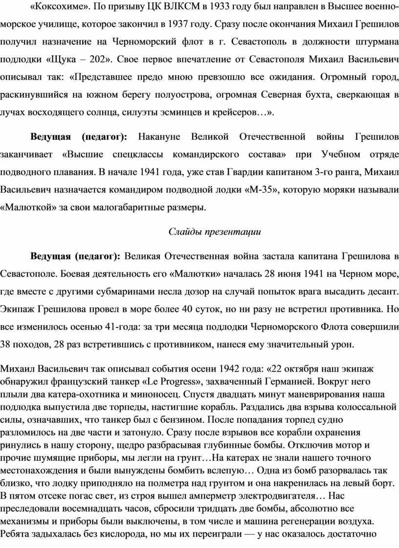 Ведущая (педагог): Накануне Великой Отечественной войны Грешилов заканчивает «Высшие спецклассы командирского состава» при Учебном отряде подводного плавания. В начале 1941 года, уже став Гвардии капитаном 3-го ранга, Михаил Васильевич назначается командиром подводной лодки «М-35», которую моряки называли «Малюткой» за свои малогабаритные размеры.