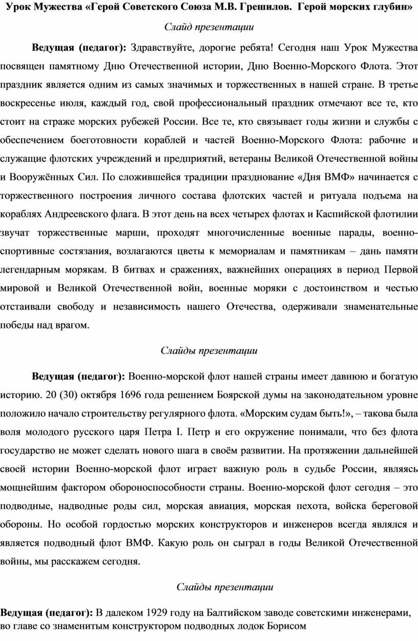 Урок Мужества «Герой Советского Союза М.В. Грешилов. Герой морских глубин»