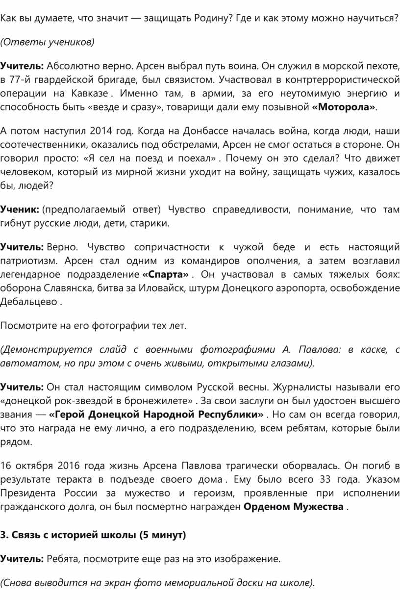 Учитель: Эта доска — память о человеке, чья судьба неразрывно связана с нашим городом и с нашей школой. Сегодня мы поговорим о нашем земляке, герое, чей подвиг стал частью истории. Мы поговорим о Арсене Сергеевиче Павлове, известном всему миру под позывным «Моторола».
