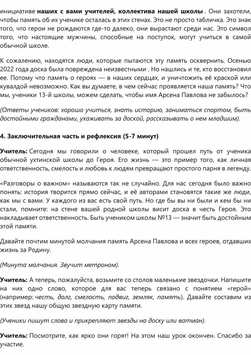 Учитель: Сегодня мы говорили о человеке, который прошел путь от ученика обычной ухтинской школы до Героя. Его жизнь — это пример того, как личная ответственность, смелость и любовь к людям превращают простого парня в легенду.