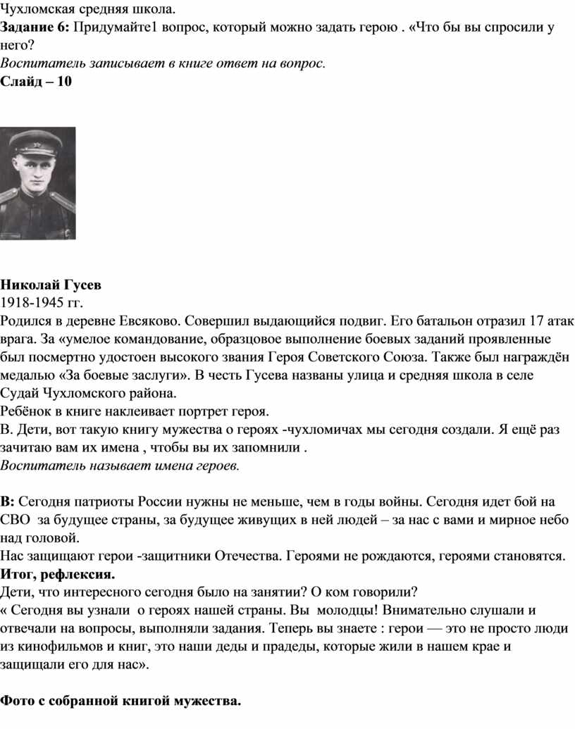 « Сегодня вы узнали о героях нашей страны. Вы молодцы! Внимательно слушали и