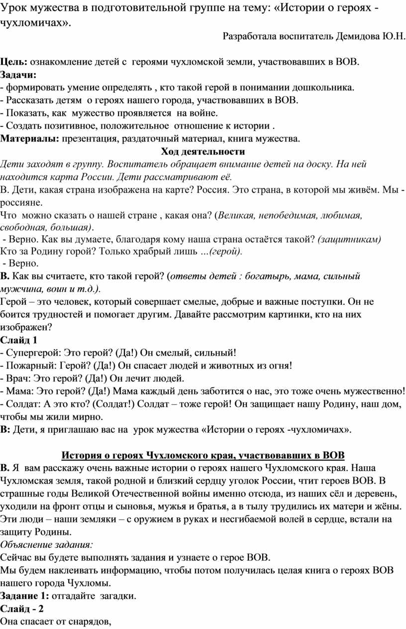 Урок мужества в подготовительной группе на тему: «Истории о героях -чухломичах».