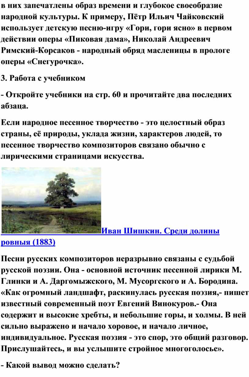 Песни русских композиторов неразрывно связаны с судьбой русской поэзии. Она - основной источник песенной лирики М. Глинки и А. Даргомыжского, М. Мусоргского и А. Бородина. «Как огромный ландшафт, раскинулась русская поэзия,- пишет известный современный поэт Евгений Винокуров.- Она содержит и высокие хребты, и небольшие горы, и холмы. В ней сильно выражено и начало хоровое, и начало личное, индивидуальное. Русская поэзия - это спор, это общий разговор. Прислушайтесь, и вы услышите стройное многоголосье».