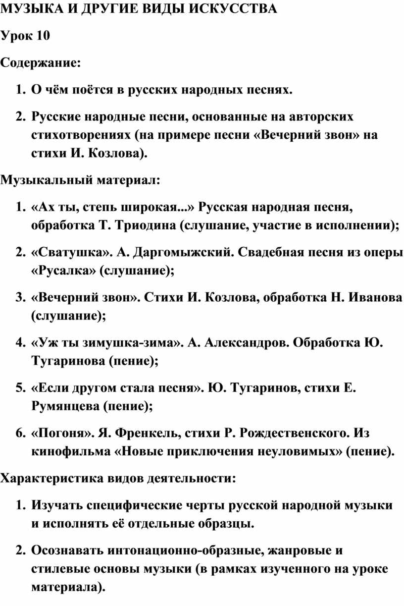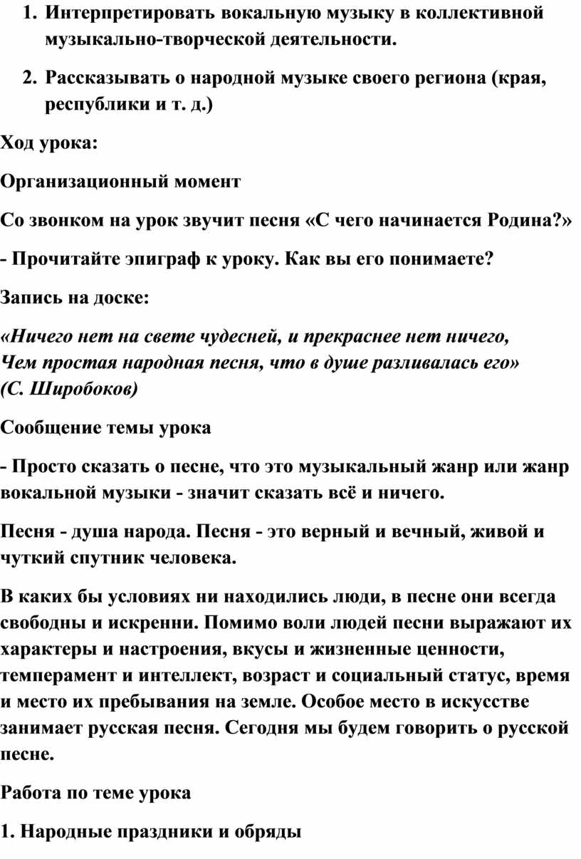 1. Изучать специфические черты русской народной музыки и исполнять её отдельные образцы.