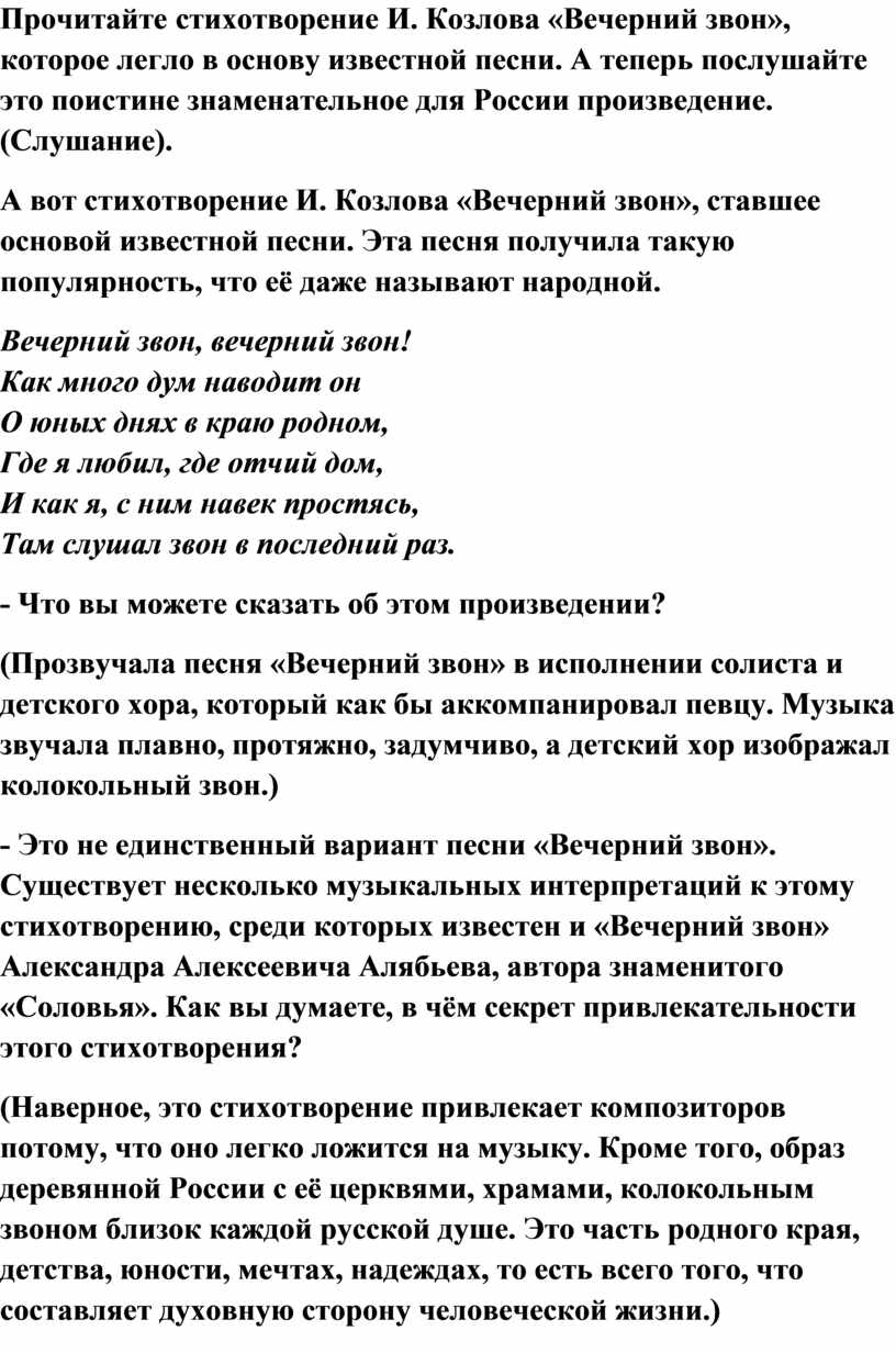 Прочитайте стихотворение И. Козлова «Вечерний звон», которое легло в основу известной песни. А теперь послушайте это поистине знаменательное для России произведение. (Слушание).