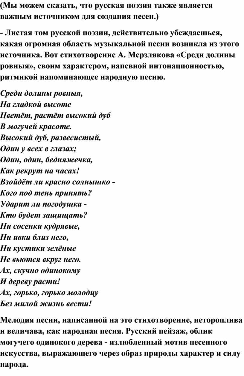 - Листая том русской поэзии, действительно убеждаешься, какая огромная область музыкальной песни возникла из этого источника. Вот стихотворение А. Мерзлякова «Среди долины ровныя», своим характером, напевной интонационностью, ритмикой напоминающее народную песню.