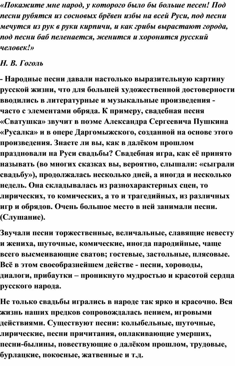- Народные песни давали настолько выразительную картину русской жизни, что для большей художественной достоверности вводились в литературные и музыкальные произведения - часто с элементами обряда. К примеру, свадебная песня «Сватушка» звучит в поэме Александра Сергеевича Пушкина «Русалка» и в опере Даргомыжского, созданной на основе этого произведения. Знаете ли вы, как в далёком прошлом праздновали на Руси свадьбы? Свадебная игра, как её принято называть (во многих сказках вы, вероятно, слышали: «сыграли свадьбу»), продолжалась несколько дней, а иногда и несколько недель. Она складывалась из разнохарактерных сцен, то лирических, то комических, а то и трагедийных, из различных игр и обрядов. Очень большое место в ней занимали песни. (Слушание).