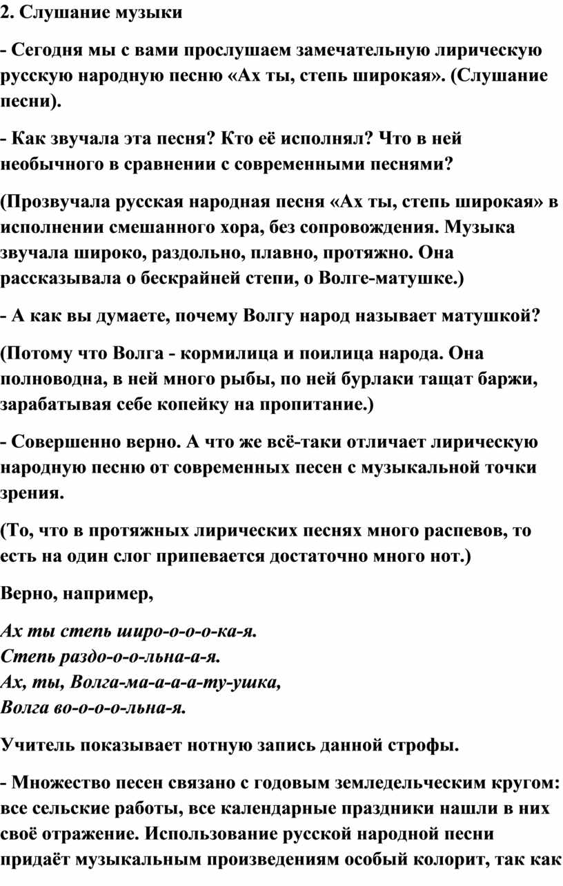 (Прозвучала русская народная песня «Ах ты, степь широкая» в исполнении смешанного хора, без сопровождения. Музыка звучала широко, раздольно, плавно, протяжно. Она рассказывала о бескрайней степи, о Волге-матушке.)