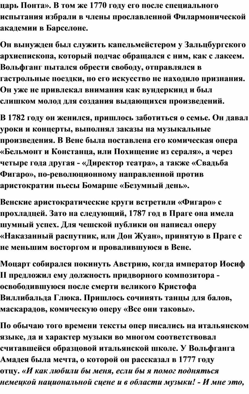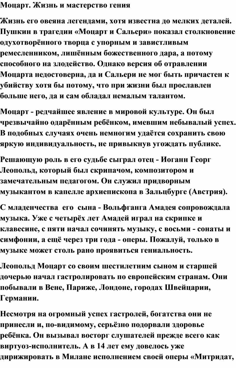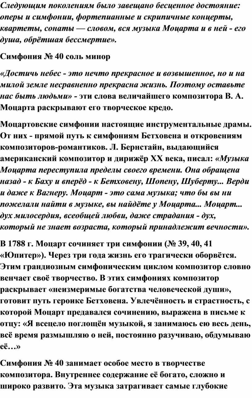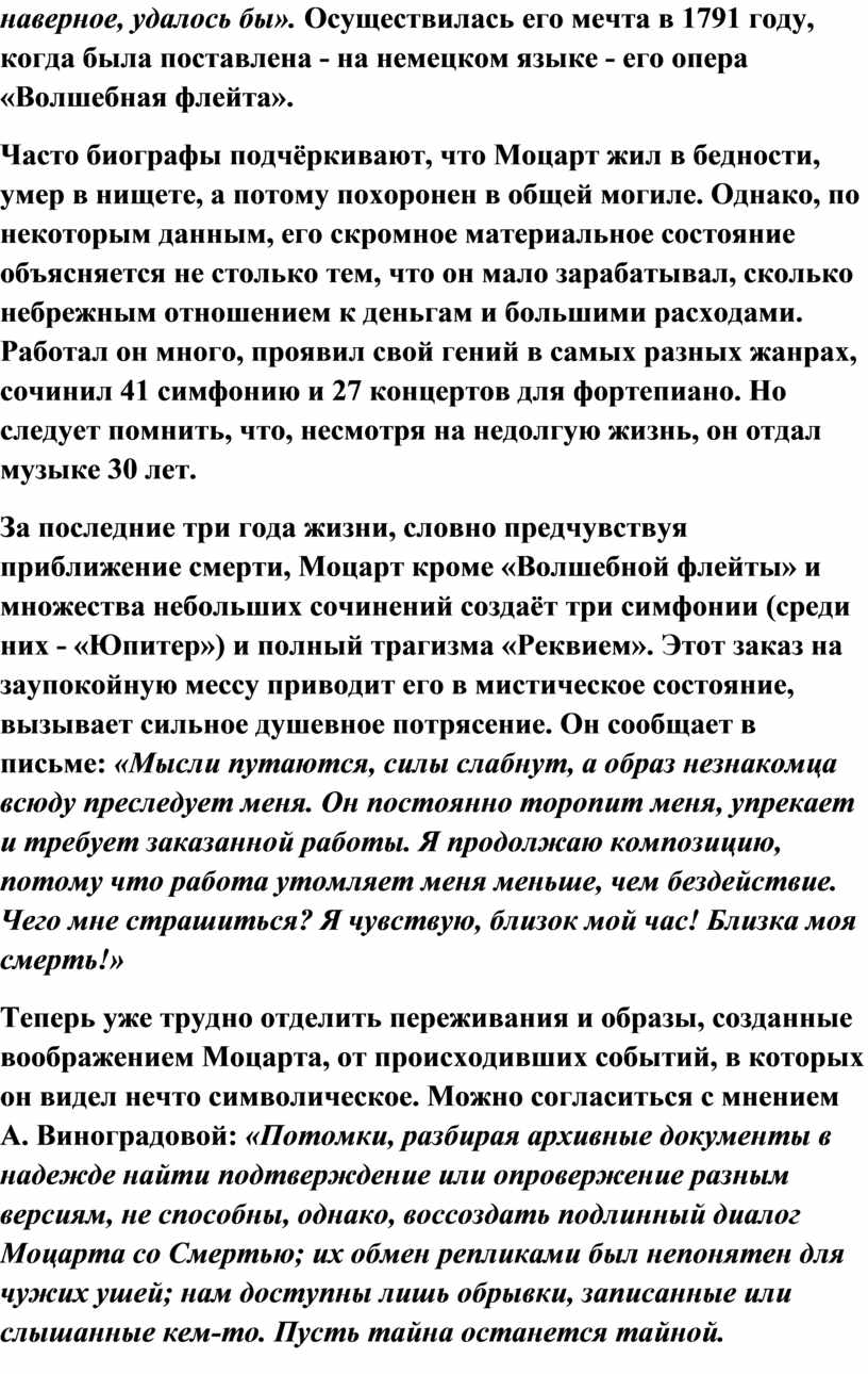 «Достичь небес - это нечто прекрасное и возвышенное, но и на милой земле несравненно прекрасна жизнь. Поэтому оставьте нас быть людьми» - эти слова величайшего композитора В. А. Моцарта раскрывают его творческое кредо.