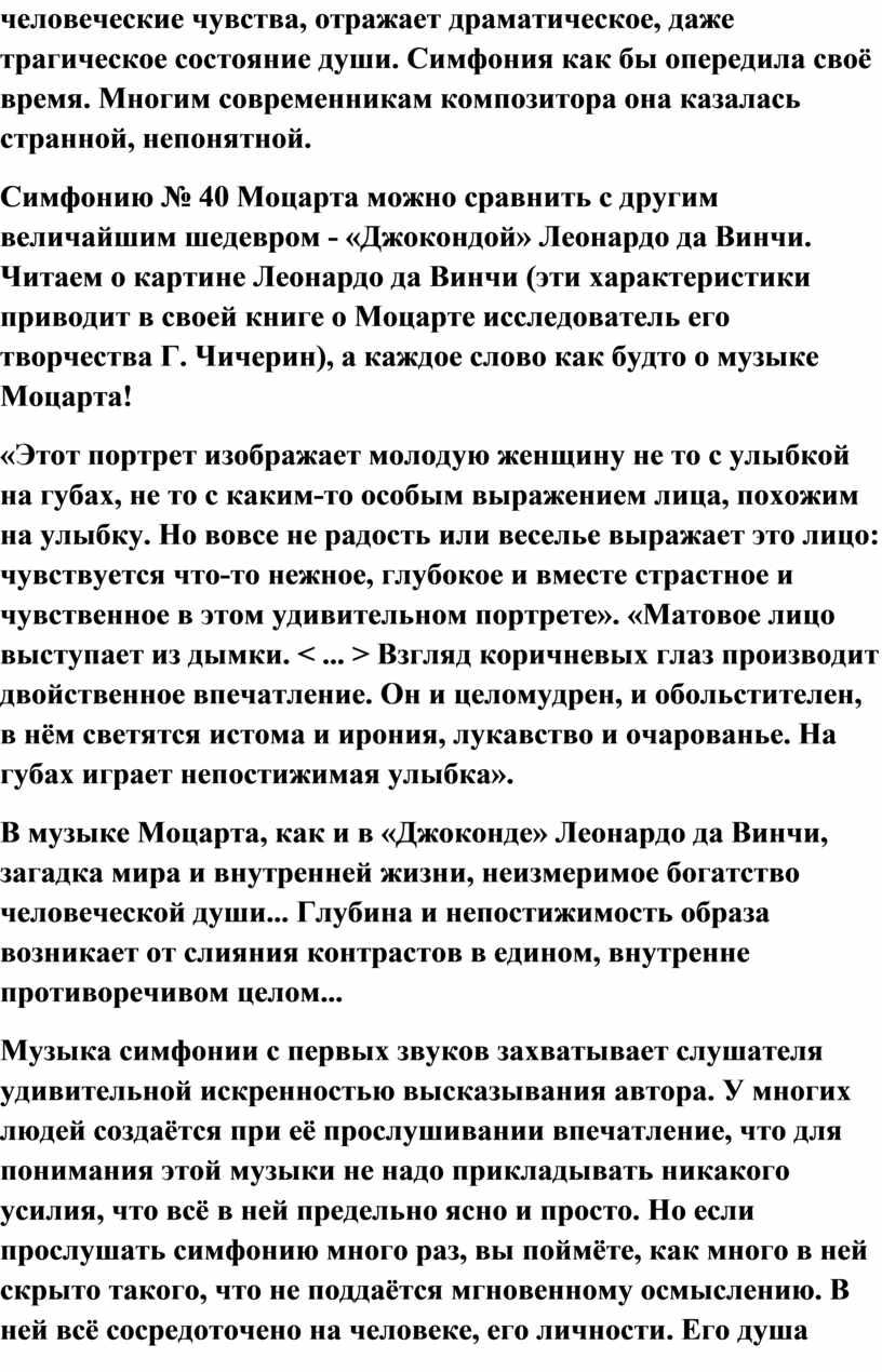 Симфонию № 40 Моцарта можно сравнить с другим величайшим шедевром - «Джокондой» Леонардо да Винчи. Читаем о картине Леонардо да Винчи (эти характеристики приводит в своей книге о Моцарте исследователь его творчества Г. Чичерин), а каждое слово как будто о музыке Моцарта!