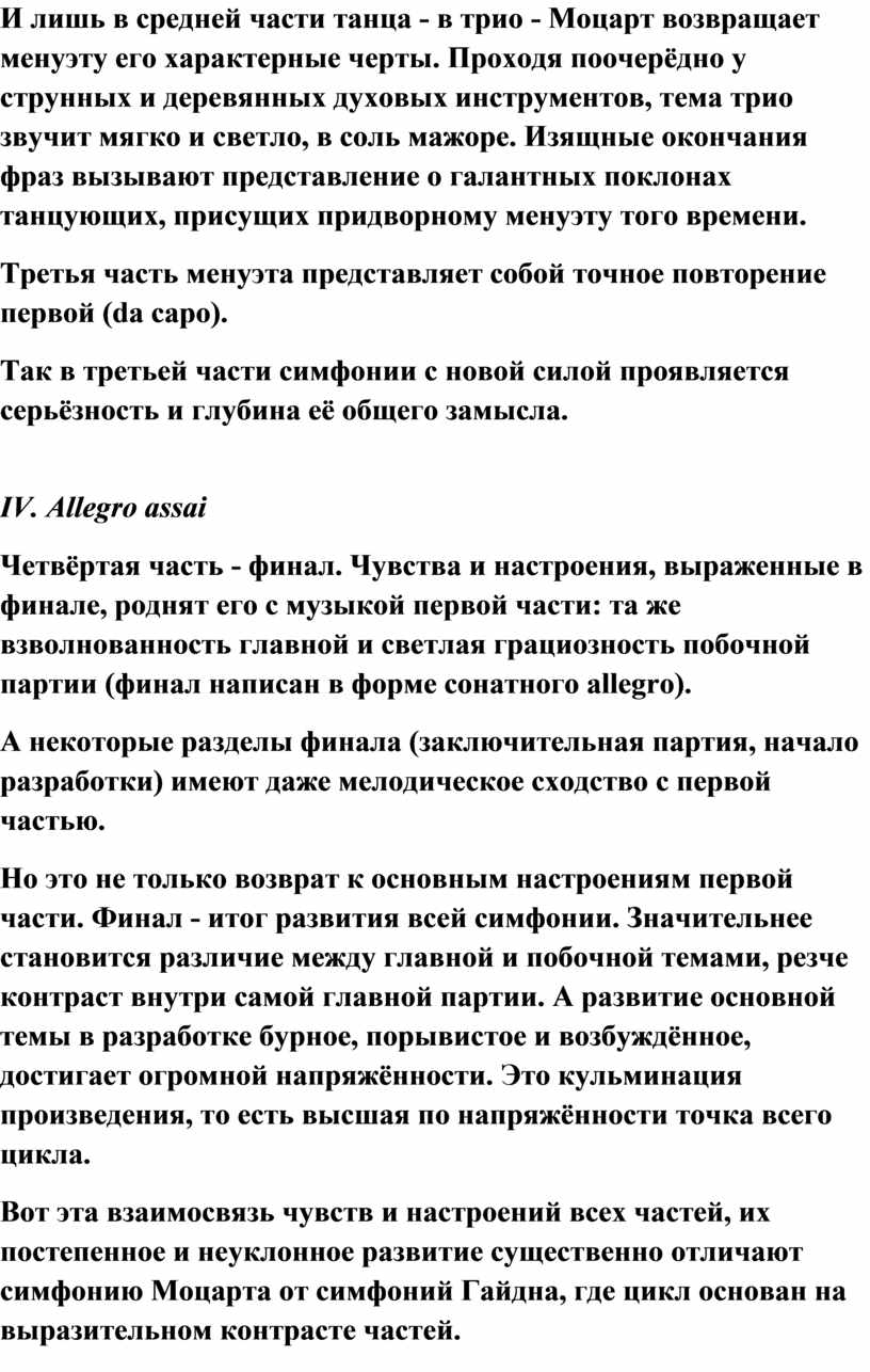 Вот эта взаимосвязь чувств и настроений всех частей, их постепенное и неуклонное развитие существенно отличают симфонию Моцарта от симфоний Гайдна, где цикл основан на выразительном контрасте частей.