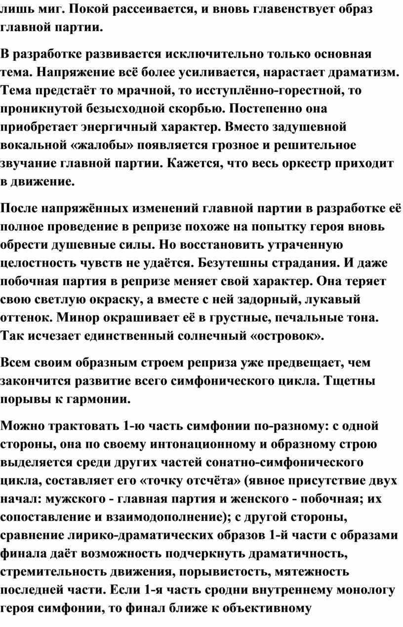 Но это не только возврат к основным настроениям первой части. Финал - итог развития всей симфонии. Значительнее становится различие между главной и побочной темами, резче контраст внутри самой главной партии. А развитие основной темы в разработке бурное, порывистое и возбуждённое, достигает огромной напряжённости. Это кульминация произведения, то есть высшая по напряжённости точка всего цикла.