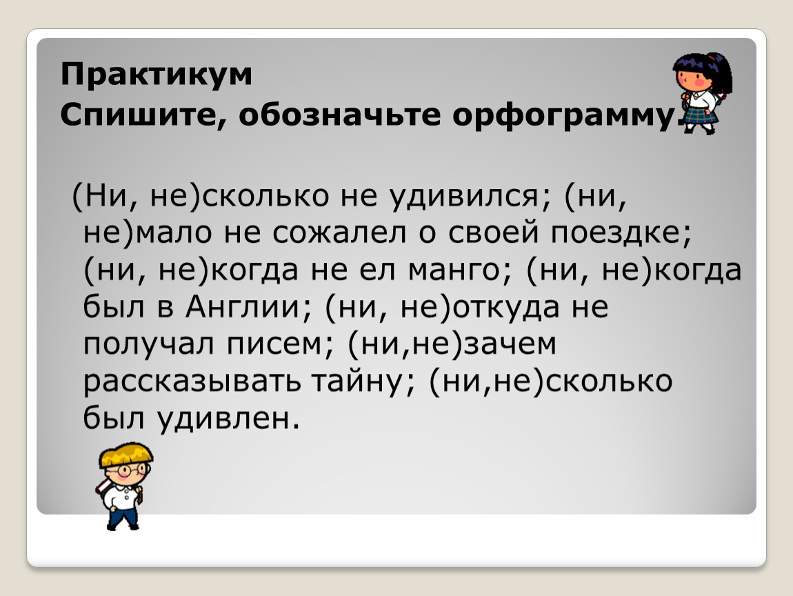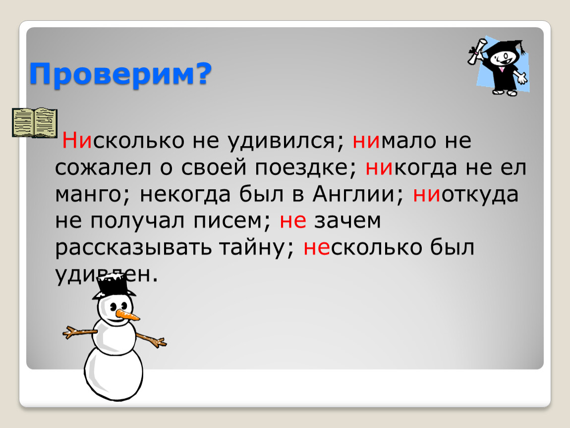 Нисколько не удивился; нимало не сожалел о своей поездке; никогда не ел манго; некогда был в Англии; ниоткуда не получал писем; не зачем рассказывать тайну; несколько был удивлен.