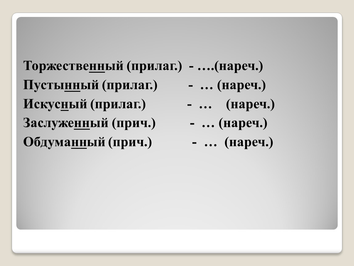 Торжественный (прилаг.) - ….(нареч.)Пустынный (прилаг.) - … (нареч.)Искусный (прилаг.) - … (нареч.)Заслуженный (прич.) - … (нареч.)Обдуманный (прич.) - … (нареч.)