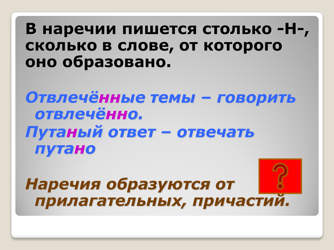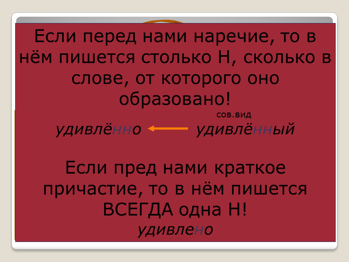 В наречии пишется столько -Н-, сколько в слове, от которого оно образовано.