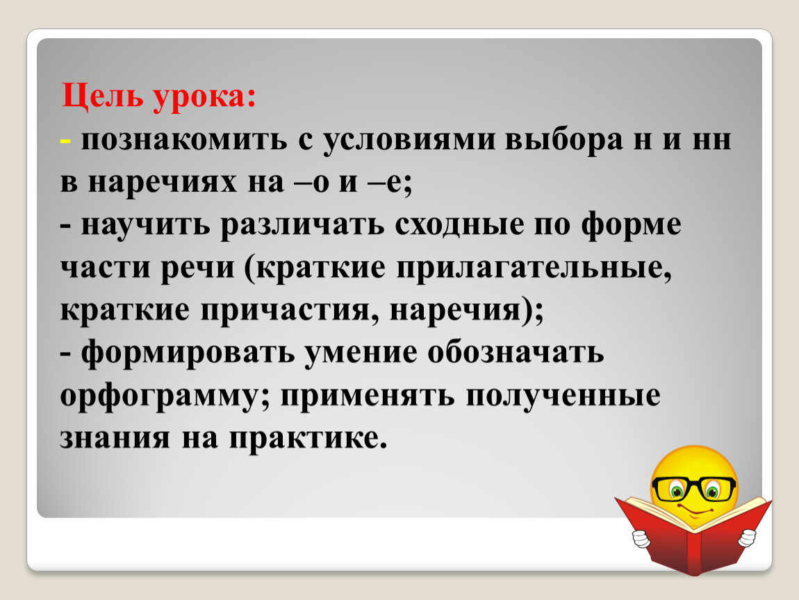 Цель урока:- познакомить с условиями выбора н и нн в наречиях на –о и –е;- научить различать сходные по форме части речи (краткие прилагательные, краткие причастия, наречия);- формировать умение обозначатьорфограмму; применять полученные знания на практике.