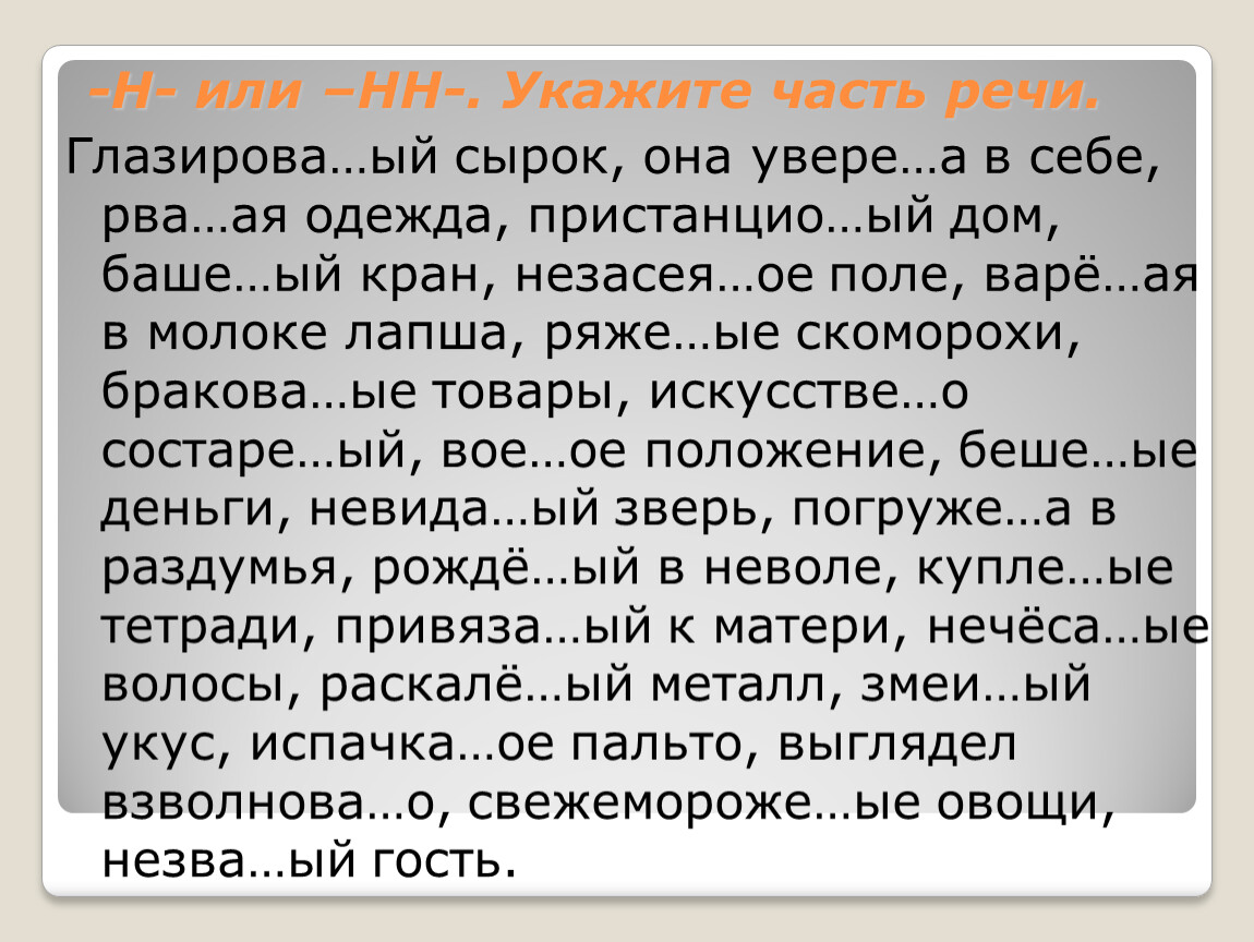 Глазирова…ый сырок, она увере…а в себе, рва…ая одежда, пристанцио…ый дом, баше…ый кран, незасея…ое поле, варё…ая в молоке лапша, ряже…ые скоморохи, бракова…ые товары, искусстве…о состаре…ый, вое…ое положение, беше…ые деньги, невида…ый зверь, погруже…а в раздумья, рождё…ый в неволе, купле…ые тетради, привяза…ый к матери, нечёса…ые волосы, раскалё…ый металл, змеи…ый укус, испачка…ое пальто, выглядел взволнова…о, свежемороже…ые овощи, незва…ый гость.