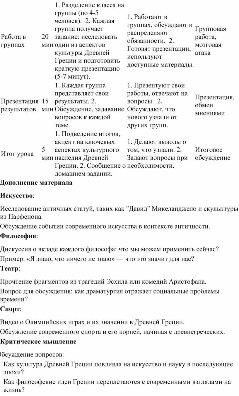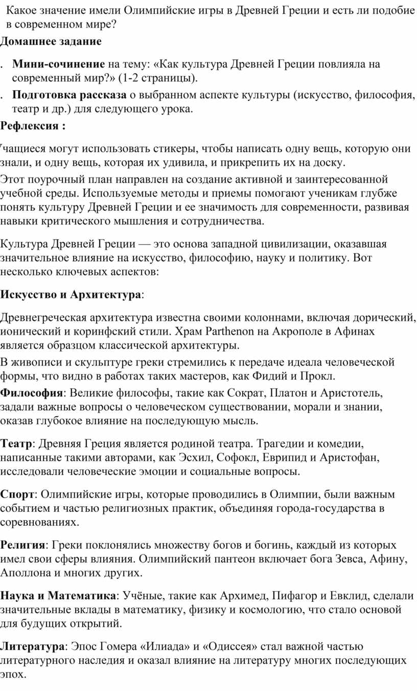 Этот поурочный план направлен на создание активной и заинтересованной учебной среды. Используемые методы и приемы помогают ученикам глубже понять культуру Древней Греции и ее значимость для современности, развивая навыки критического мышления и сотрудничества.