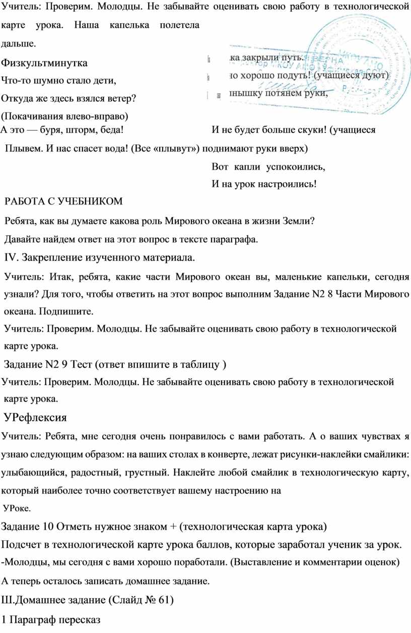 Учитель: Проверим. Молодцы. Не забывайте оценивать свою работу в технологической карте урока. Наша капелька полетела дальше.