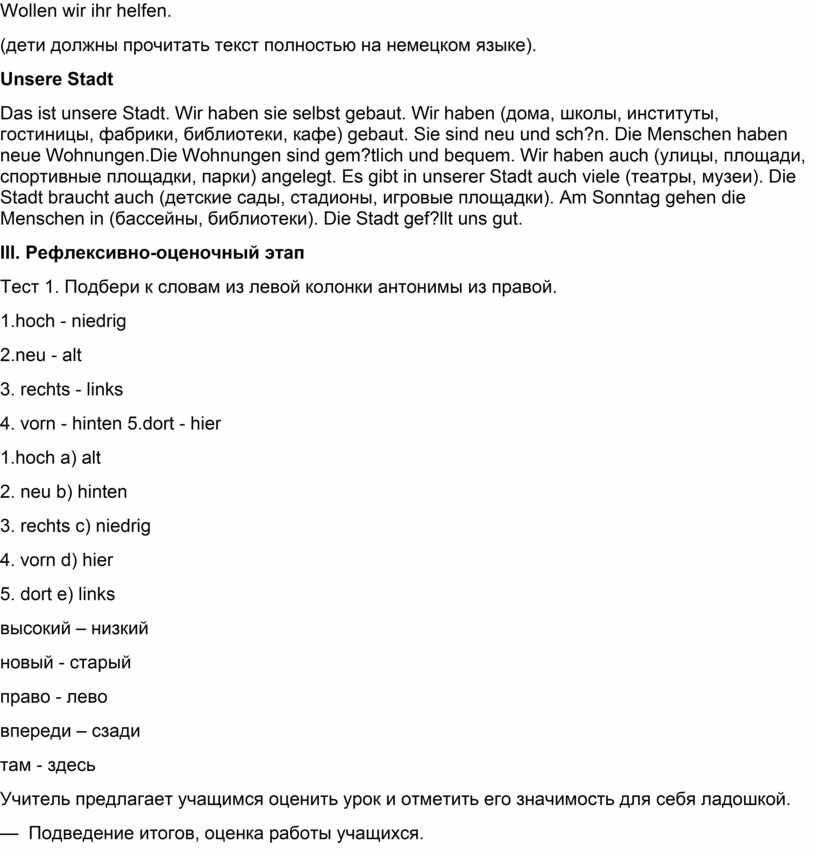 Das ist unsere Stadt. Wir haben sie selbst gebaut. Wir haben (дома, школы, институты, гостиницы, фабрики, библиотеки, кафе) gebaut. Sie sind neu und sch?n. Die Menschen haben neue Wohnungen.Die Wohnungen sind gem?tlich und bequem. Wir haben auch (улицы, площади, спортивные площадки, парки) angelegt. Es gibt in unserer Stadt auch viele (театры, музеи). Die Stadt braucht auch (детские сады, стадионы, игровые площадки). Am Sonntag gehen die Menschen in (бассейны, библиотеки). Die Stadt gef?llt uns gut.