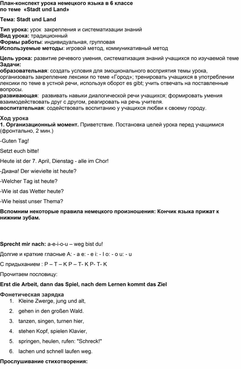 План-конспект урока немецкого языка в 6 классе