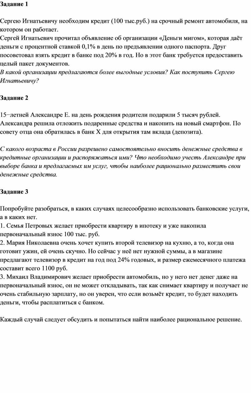 Сергей Игнатьевич прочитал объявление об организации «Деньги мигом», которая даёт деньги с процентной ставкой 0,1% в день по предъявлении одного паспорта. Друг посоветовал взять кредит в банке под 20% в год. Но в этот банк требуется предоставить целый пакет документов.