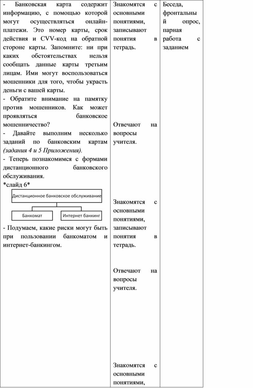 - Банковская карта содержит информацию, с помощью которой могут осуществляться онлайн-платежи. Это номер карты, срок действия и CVV-код на обратной стороне карты. Запомните: ни при каких обстоятельствах нельзя сообщать данные карты третьим лицам. Ими могут воспользоваться мошенники для того, чтобы украсть деньги с вашей карты. - Обратите внимание на памятку против мошенников. Как может проявляться банковское мошенничество? - Давайте выполним несколько заданий по банковским картам (задания 4 и 5 Приложения). - Теперь познакомимся с формами дистанционного банковского обслуживания. *слайд 6*