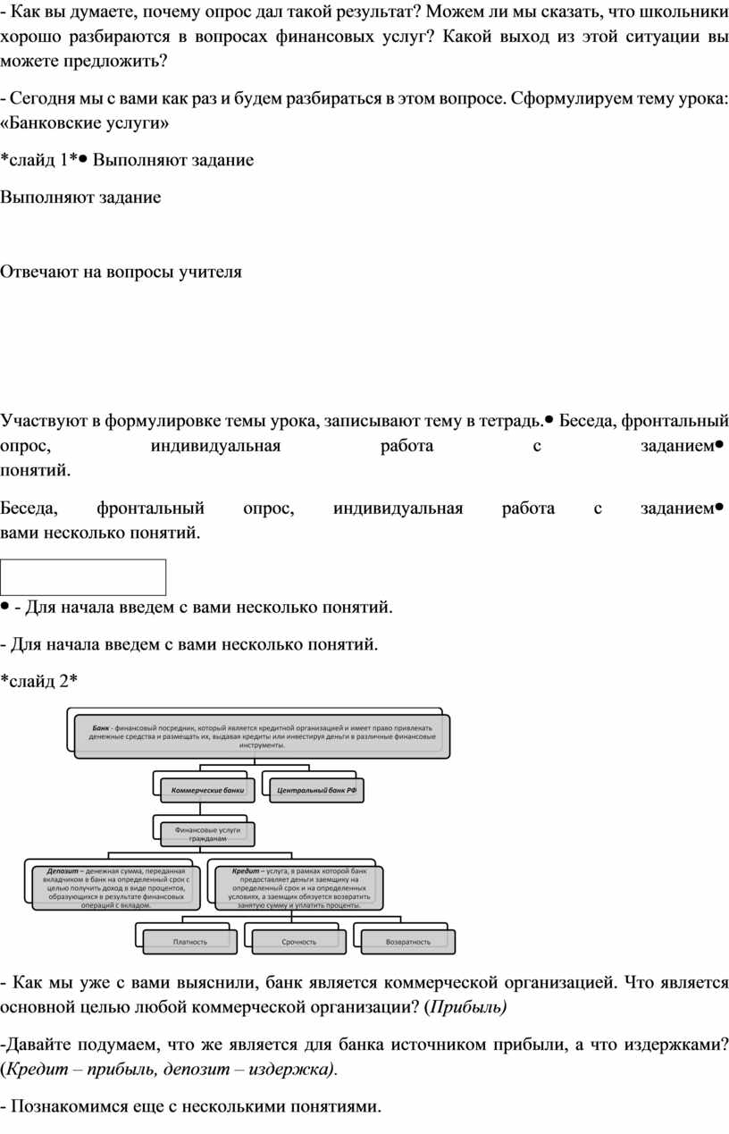 Основное содержание темы: Понятие банков. Банковские услуги, предоставляемые гражданам – кредит, депозит. Микрофинансовые организации. Виды банковских карт. Дистанционное банковское обслуживание. Мошенничество в банковской сфере.