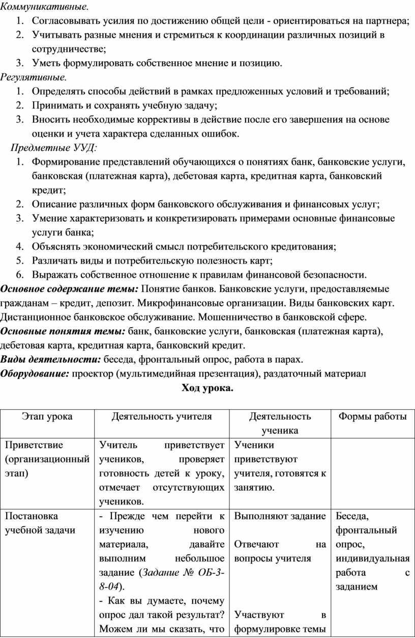 1. Формирование представлений обучающихся о понятиях банк, банковские услуги, банковская (платежная карта), дебетовая карта, кредитная карта, банковский кредит;