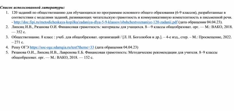 1. 120 заданий по обществознанию для обучающихся по программам основного общего образования (6-9 классов), разработанные в соответствии с моделями заданий, развивающих читательскую грамотность и коммуникативную компетентность в письменной речи. - http://doc.fipi.ru/metodicheskaya-kopilka/zadaniya-dlya-5-9-klassov/obshchestvoznaniye-120-zadanii.pdf (дата обращения 04.04.23).