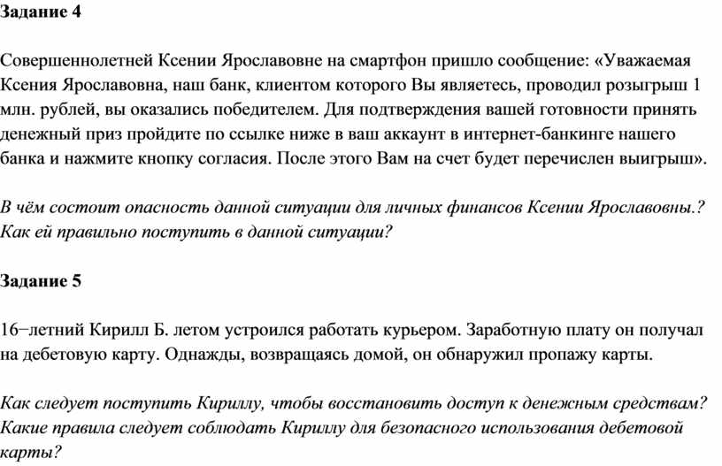 Совершеннолетней Ксении Ярославовне на смартфон пришло сообщение: «Уважаемая Ксения Ярославовна, наш банк, клиентом которого Вы являетесь, проводил розыгрыш 1 млн. рублей, вы оказались победителем. Для подтверждения вашей готовности принять денежный приз пройдите по ссылке ниже в ваш аккаунт в интернет-банкинге нашего банка и нажмите кнопку согласия. После этого Вам на счет будет перечислен выигрыш».