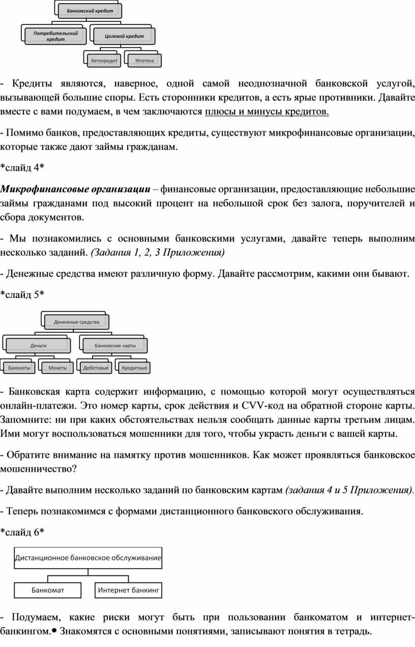 - Кредиты являются, наверное, одной самой неоднозначной банковской услугой, вызывающей большие споры. Есть сторонники кредитов, а есть ярые противники. Давайте вместе с вами подумаем, в чем заключаются плюсы и минусы кредитов. - Помимо банков, предоставляющих кредиты, существуют микрофинансовые организации, которые также дают займы гражданам. *слайд 4* Микрофинансовые организации – финансовые организации, предоставляющие небольшие займы гражданами под высокий процент на небольшой срок без залога, поручителей и сбора документов. - Мы познакомились с основными банковскими услугами, давайте теперь выполним несколько заданий. (Задания 1, 2, 3 Приложения) - Денежные средства имеют различную форму. Давайте рассмотрим, какими они бывают. *слайд 5*