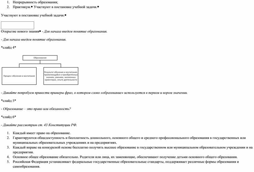- Давайте попробуем привести примеры фраз, в котором слово «образование» используется в первом и вором значении. *слайд 5* - Образование – это право или обязанность? *слайд 6* - Давайте рассмотрим ст. 43 Конституции РФ. 1. Каждый имеет право на образование. 2. Гарантируются общедоступность и бесплатность дошкольного, основного общего и среднего профессионального образования в государственных или муниципальных образовательных учреждениях и на предприятиях. 3. Каждый вправе на конкурсной основе бесплатно получить высшее образование в государственном или муниципальном образовательном учреждении и на предприятии. 4. Основное общее образование обязательно. Родители или лица, их заменяющие, обеспечивают получение детьми основного общего образования. 5. Российская Федерация устанавливает федеральные государственные образовательные стандарты, поддерживает различные формы образования и самообразования. - Как вы думаете, почему государство так поддерживает получение своими гражданами образования? - Давайте попробуем самостоятельно определить, в чем состоит важность образования как для общества, так и для отдельной личности. *слайд 7*