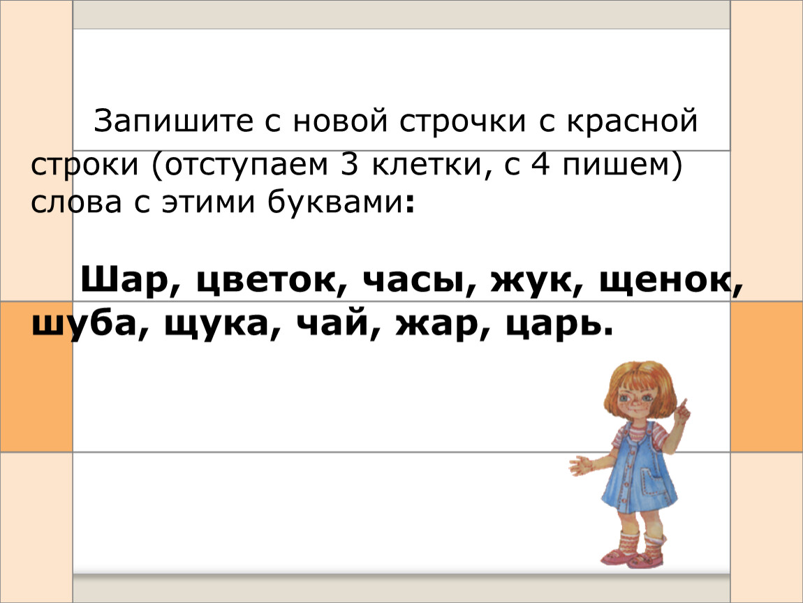 Запишите с новой строчки с красной строки (отступаем 3 клетки, с 4 пишем) слова с этими буквами: