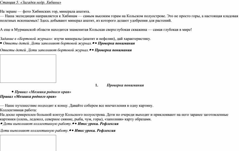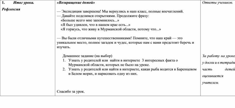 — Экспедиция завершена! Мы вернулись в наш класс, полные впечатлений. — Давайте поделимся открытиями. Продолжите фразу: «Больше всего мне запомнилось...» «Я был удивлен, что в нашем крае есть...» «Я горжусь, что живу в Мурманской области, потому что...»