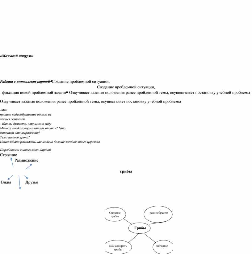 Озвучивает важные положения ранее пройденной темы, осуществляет постановку учебной проблемы -Мне пришло видеообращение одного из лесных жителей. - Как вы думаете, что имел в виду Мишка, когда говорил «тихая охота»? Что означает это выражение? Тема нашего урока? Наша задача разгадать как можно больше загадок этого царства. Поработаем с интеллект-картой