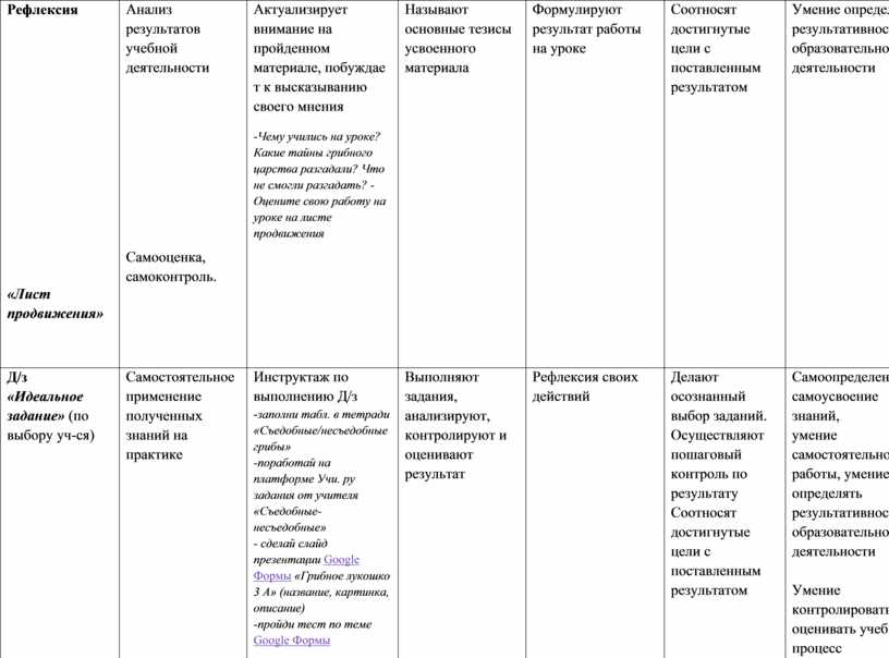 Актуализирует внимание на пройденном материале, побуждает к высказыванию своего мнения -Чему учились на уроке? Какие тайны грибного царства разгадали? Что не смогли разгадать? -Оцените свою работу на уроке на листе продвижения |