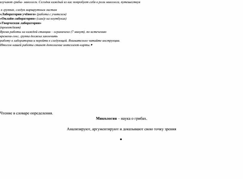 Организует устный анализ изложенной учебной задачи, фиксирует предложенные учениками гипотезы, курирует их обсуждение Искать ответы на загадки грибного царства мы будем, путешествуя по станциям-лабораториям Микологии. Предположите, что такое микология. Ученые, которые изучают грибы- микологи. Сегодня каждый из вас попробует себя в роли миколога, путешествуя в группах, следуя маршрутным листам «Лаборатория учёного» (работа с учителем) «Онлайн-лаборатория» (сам/р на ноутбуках) «Творческая лаборатория» (проект/деят) Время работы на каждой станции – ограничено (7 минут), по истечению времени-гонг, группа должна закончить работу в лаборатории и перейти к следующей. Внимательно читайте инструкции. Итогом нашей работы станет дополнение интеллект-карты. |