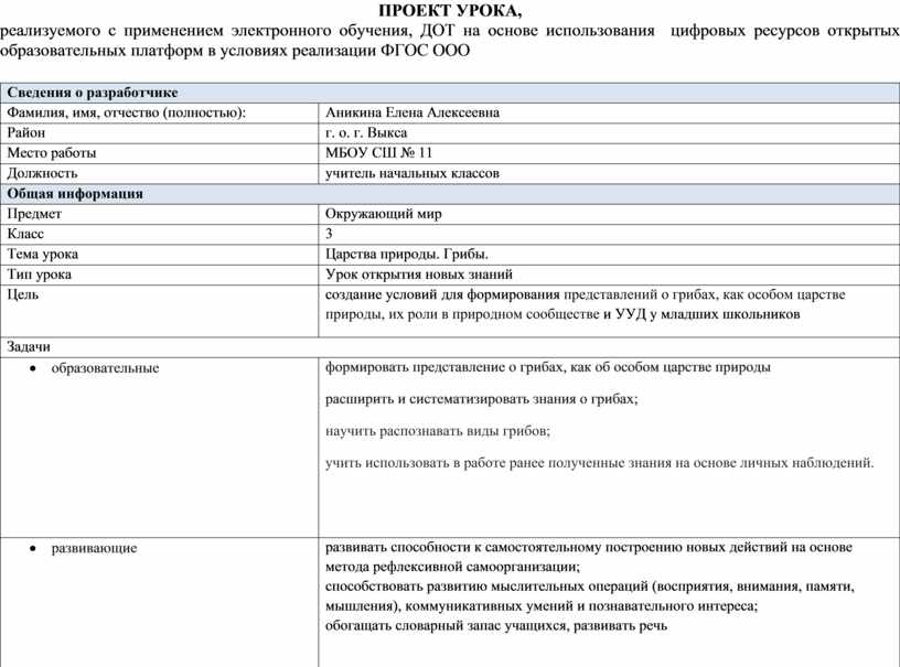 создание условий для формирования представлений о грибах, как особом царстве природы, их роли в природном сообществе и УУД у младших школьников |