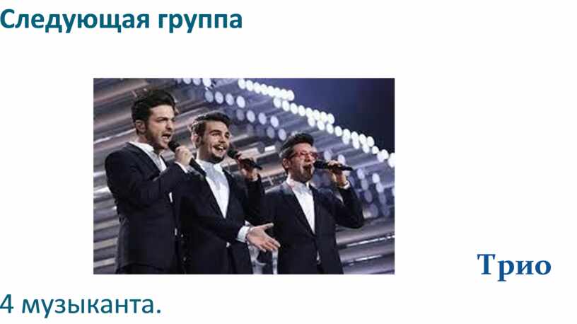 Все эти небольшие группы музыкантов (от 2 до 10 человек) называются ансамблем.