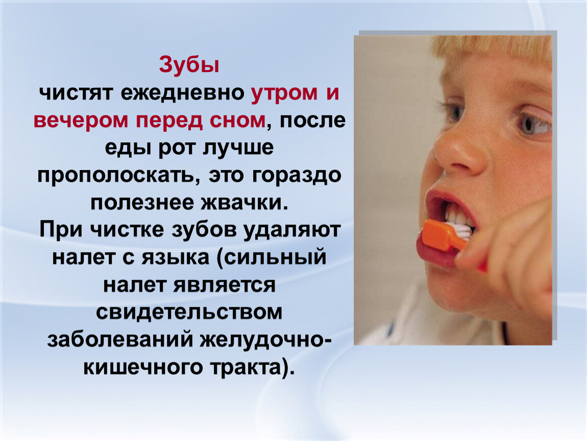 При чистке зубов удаляют налет с языка (сильный налет является свидетельством заболеваний желудочно-кишечного тракта).