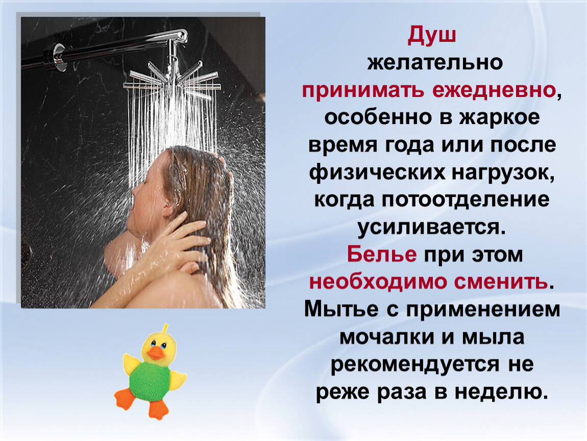 Белье при этом необходимо сменить. Мытье с применением мочалки и мыла рекомендуется не реже раза в неделю.