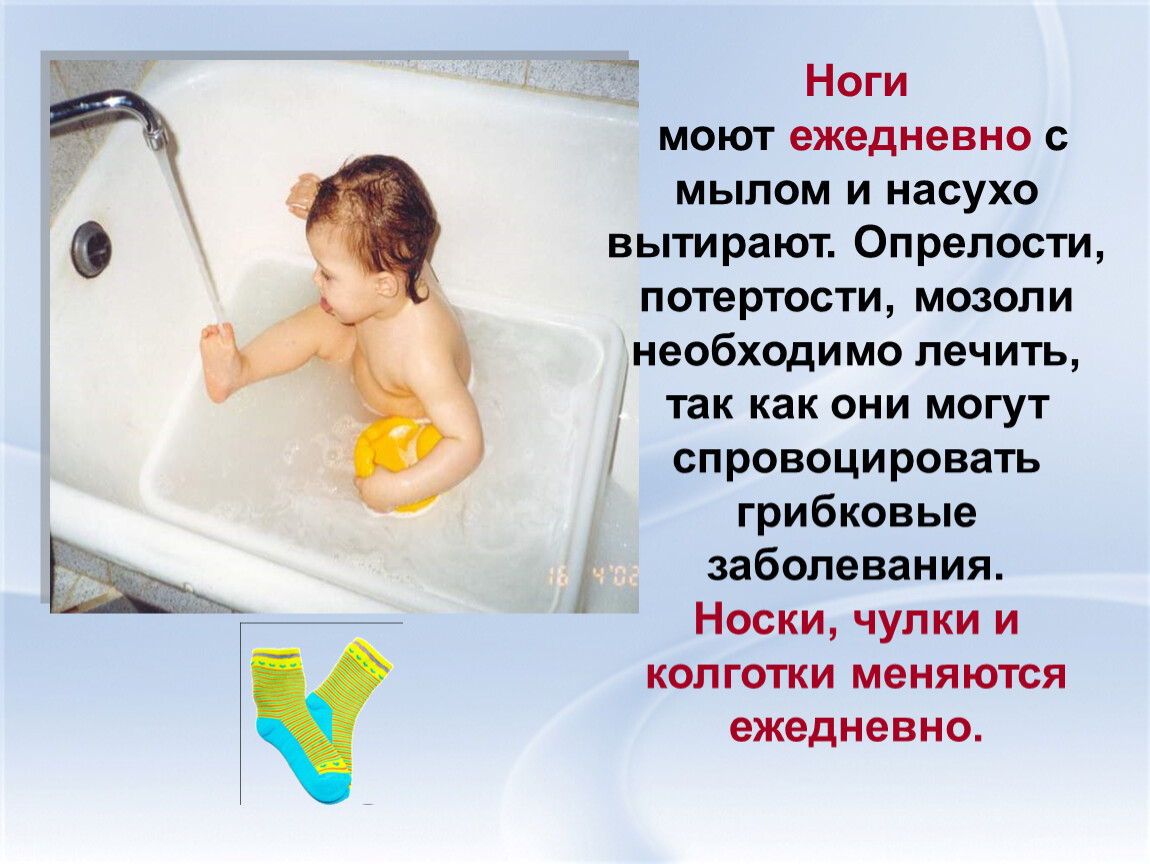 моют ежедневно с мылом и насухо вытирают. Опрелости, потертости, мозоли необходимо лечить, так как они могут спровоцировать грибковые заболевания.